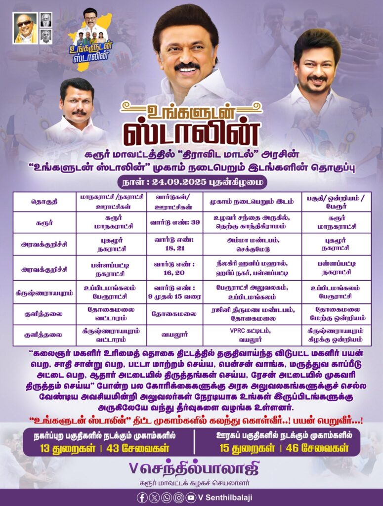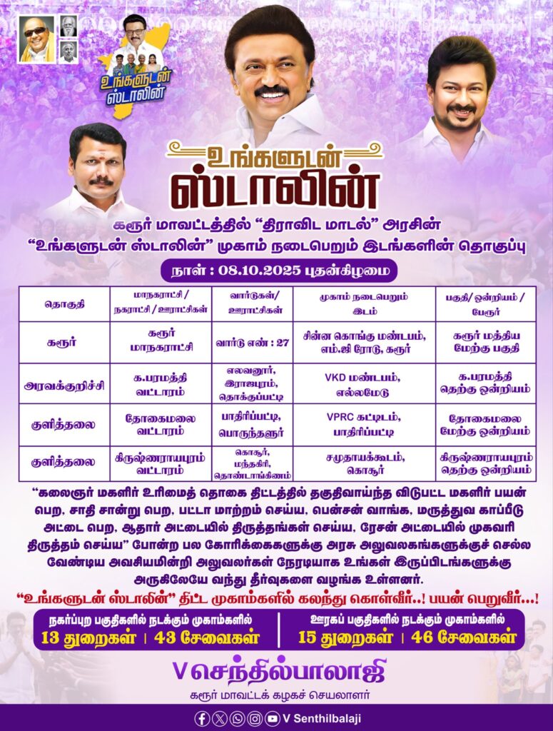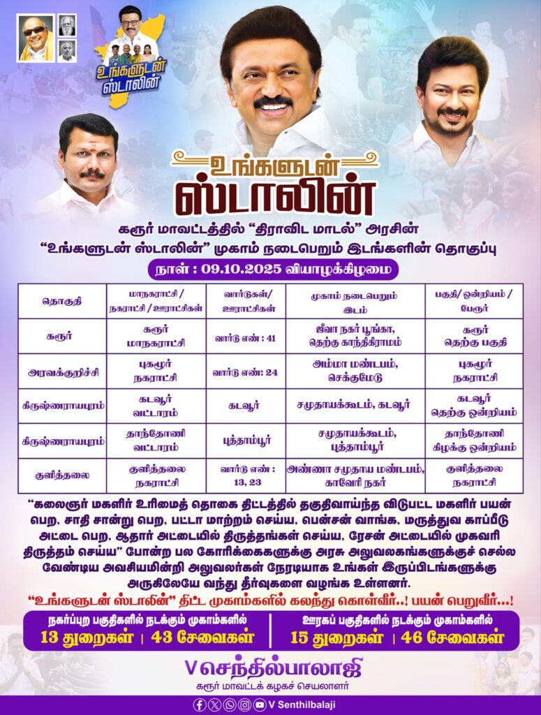 Under the visionary leadership and direction of the Hon’ble Chief Minister of Tamil Nadu, Thalapathy M.K. Stalin, special camps under the #WithYou_Stalin initiative are scheduled to be held tomorrow at multiple locations across Karur District. These camps are designed to ensure that essential government services reach the doorsteps of the people efficiently and effectively. I warmly encourage all members of the public to actively participate, submit their petitions, and avail themselves of the various benefits being provided, reflecting our administration’s steadfast commitment to inclusive development, citizen welfare, and responsive governance.