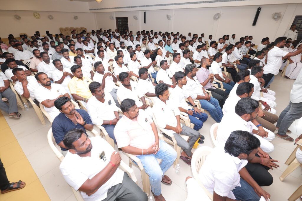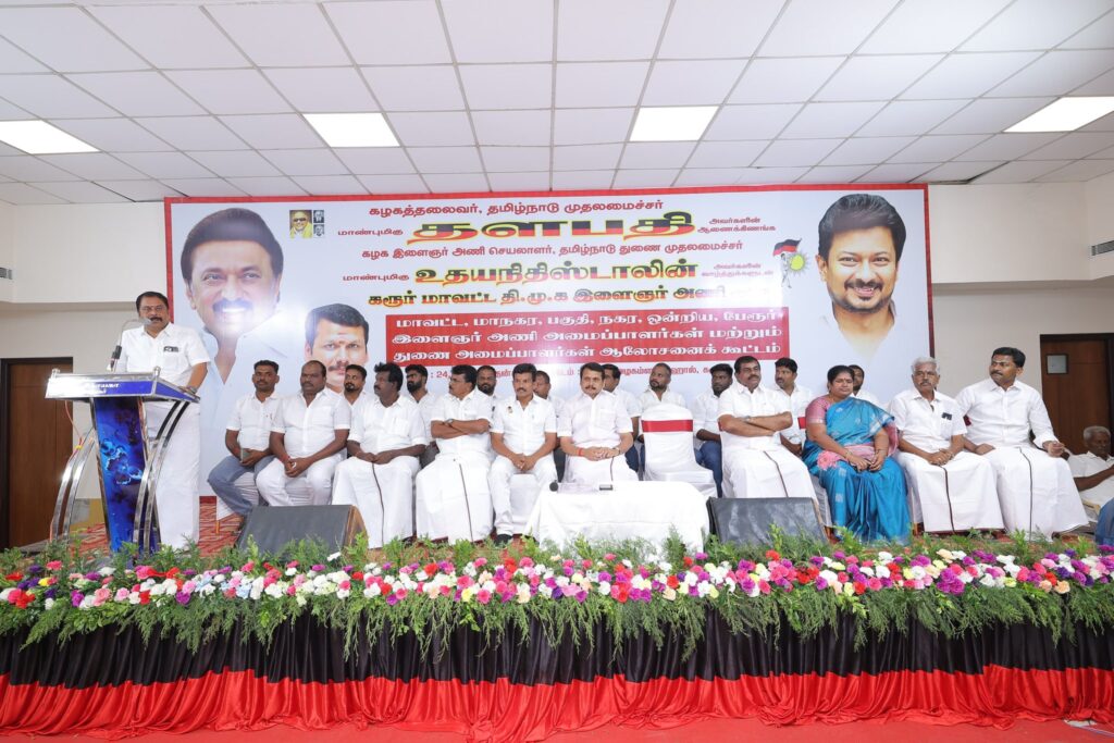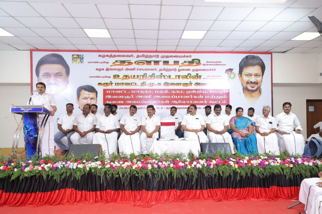 As directed by our Party President and Hon’ble Chief Minister of Tamil Nadu, Thalapathy M.K. Stalin, and with the blessings of the Hon’ble Deputy Chief Minister and Youth Wing Secretary, our beacon of hope, Thiru. Udhayanidhi Stalin, a consultative meeting of Karur District DMK Youth Wing office-bearers—covering district, city, area, town, union, and village levels—was successfully held today at Aarthi Hotel, Alagammal Mahal, Karur. The meeting was graced by the special address of DMK Youth Wing Deputy Secretary and Hon’ble Member of Parliament, Thiru. K.E. Prakash, with the participation of Hon’ble MLAs and representatives of local bodies, making it a significant and inspiring gathering.