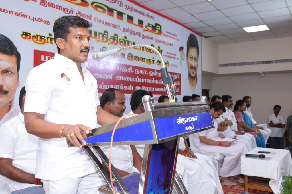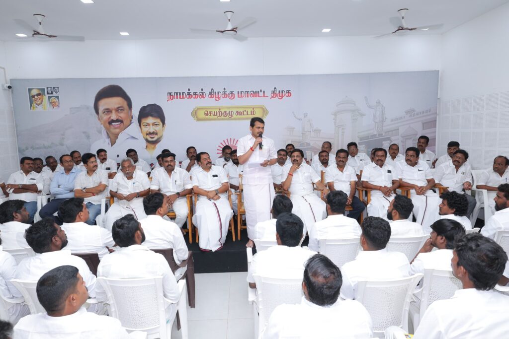 As directed by the Hon’ble Chief Minister of Tamil Nadu and Leader of Good Governance, Thalapathy M.K. Stalin, and with the blessings of the Hon’ble Deputy Chief Minister, Youth Wing Secretary, and our dynamic leader Thiru. Udhayanidhi Stalin, a consultative meeting of the Namakkal East District DMK Youth Wing was held today with great success at the esteemed Professor Hall in the Kalaignar Arivalayam, Namakkal. The meeting brought together Youth Wing office-bearers and deputy organizers from district, city, area, town, union, and village levels. It was marked by the inspiring addresses of DMK Youth Wing Deputy Secretary and Hon’ble Member of Parliament, Thiru. K.E. Prakash, and Namakkal East District Secretary and Hon’ble Member of Parliament, Thiru. K.R.N. Rajeshkumar. The event also saw the participation of Hon’ble Namakkal MLA Thiru. P. Ramalingam, Youth Wing Deputy Secretary Thiru. C. Anandakumar, Namakkal East District Youth Wing Organizer Thiru. C. Vishwanath, along with Youth Wing administrators and representatives of local bodies, making it a significant and unifying gathering.