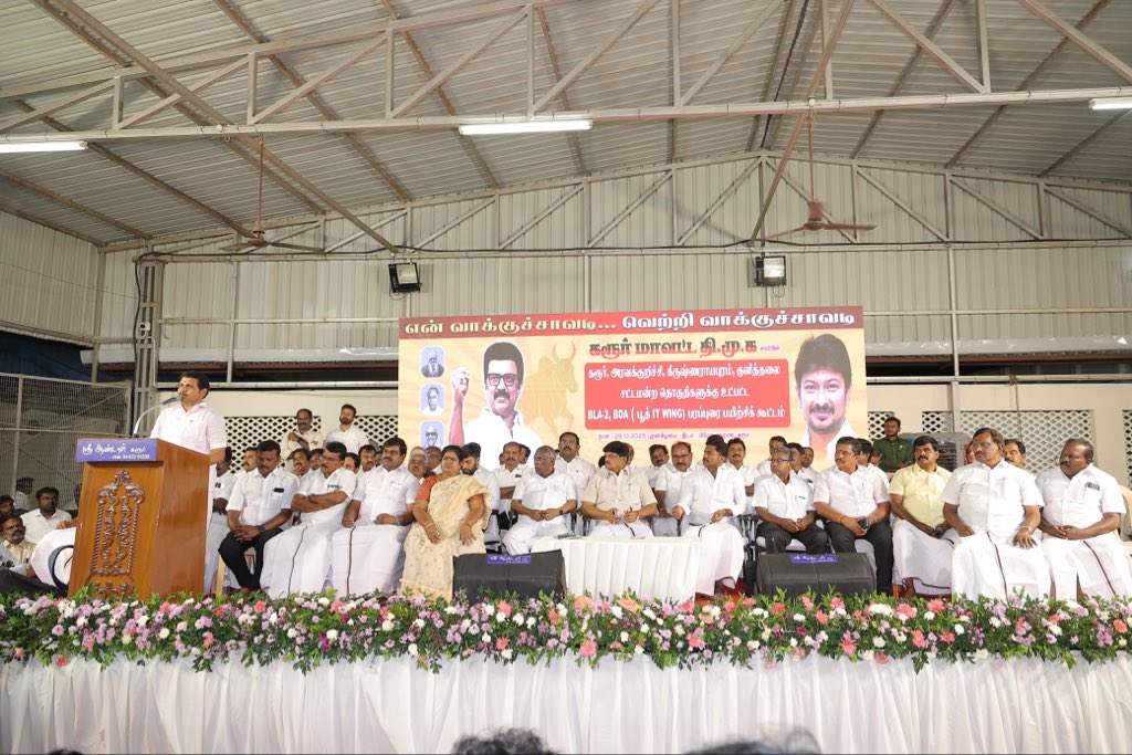 As directed by the Hon’ble Chief Minister of Tamil Nadu, Thalapathy M.K. Stalin, and under the guidance of the Hon’ble Deputy Chief Minister and our Youth Leader, Thiru Udhayanidhi Stalin, the “En Vakkuchavadi – Vetri Vakkuchavadi” consultative meeting was successfully held today at Prem Mahal, Karur. The meeting saw the participation of BLA-2 and BDA administrators from the Karur, Aravakurichi, Krishnarayapuram, and Kulithalai Assembly Constituencies, reflecting the continued efforts to strengthen grassroots-level electoral preparedness and organizational efficiency.