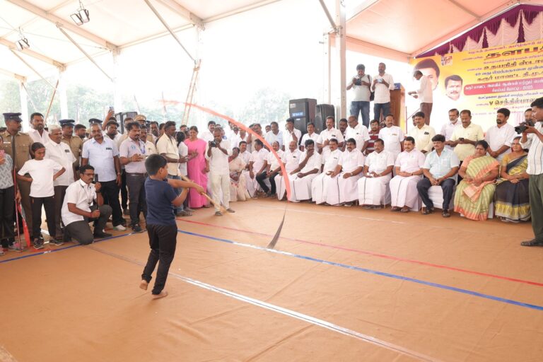 With the gracious wishes of the Hon’ble Chief Minister of Tamil Nadu, Thalapathy Thiru M.K. Stalin, and in celebration of the 49th birthday of the Hon’ble Deputy Chief Minister and our Youth Leader Thiru Udhayanidhi Stalin, a series of sports competitions worth a total prize amount of ₹49 lakh are being conducted across Karur district from yesterday till December 28. The events include kabaddi, silambam, chess, handball, badminton, football, cycling race, skating, marathon and cricket. Today, at the Karur Thiruvalluvar Grounds, where hundreds of children and youth participated, the men’s silambam event—carrying total prize money of ₹7,20,000 along with championship trophies—was formally inaugurated.