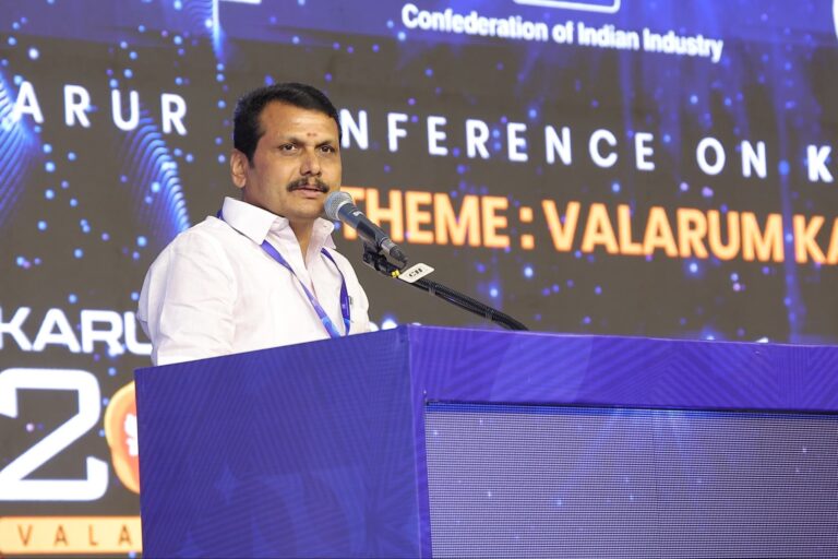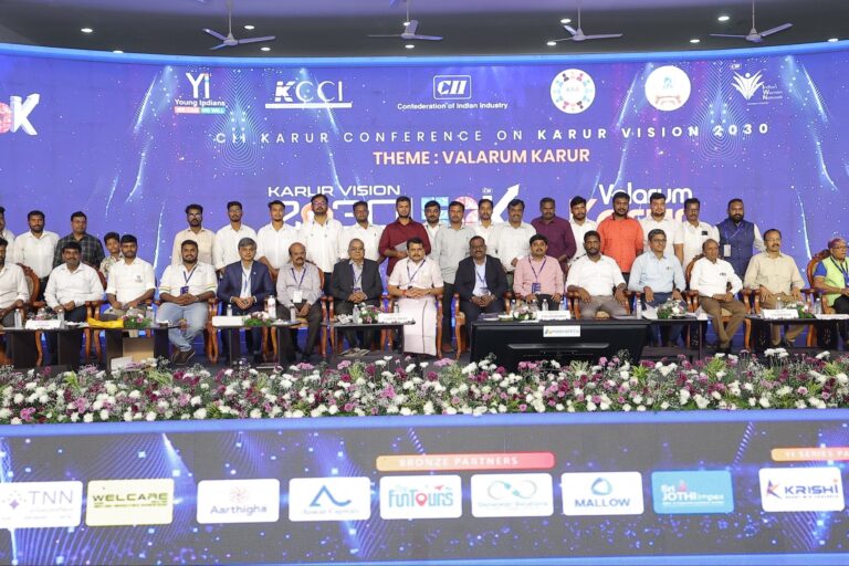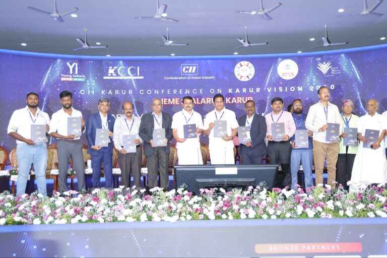 With the blessings of the Hon’ble Chief Minister of Tamil Nadu, Thalapathy Thiru M.K. Stalin, and the Hon’ble Deputy Chief Minister of Tamil Nadu, Young Leader Thiru Udhayanidhi Stalin, a major industrial development seminar was inaugurated today at the Atlas Hall in Karur.The event was jointly organised by the Karur District Confederation of Indian Industry (CII), Young Indians, Indian Women Network, the Karur Exporters Association, and 85 trade and business associations across the district.The objective of the initiative is to create awareness and drive the mission titled “KARUR VISION 2030 – A Growing Karur”, which aims to achieve a combined business target of ₹50,000 crore across all industries in Karur district by the year 2030.