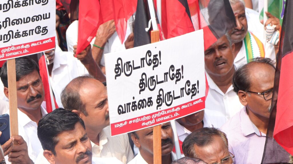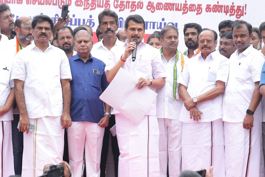 In accordance with the directives of the Hon’ble Chief Minister of Tamil Nadu, Thalapathy M.K. Stalin, the protector of the State’s welfare, a massive protest demonstration was held today in front of the Karur Head Post Office under the banner of the Secular Progressive Alliance.The protest condemned the Election Commission of India for introducing the Special Intensive Revision (SIR) of the electoral rolls in Tamil Nadu. A large number of administrators and volunteers from the DMK and its alliance parties took part in the demonstration.