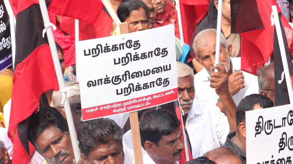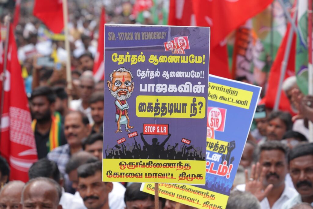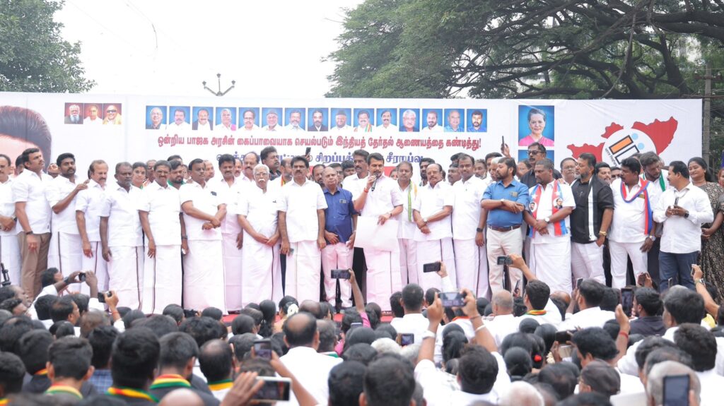 In accordance with the directives of the Hon’ble Chief Minister of Tamil Nadu and the guardian of democracy, Thalapathy M.K. Stalin, who has reminded us that preventing the implementation of the SIR initiative is our foremost duty and who is leading the legal battle against it, a massive protest demonstration was organized today at Sivananda Colony, Coimbatore, under the banner of the Secular Progressive Alliance.A large number of administrators and volunteers from the DMK and its alliance parties took part in the demonstration.