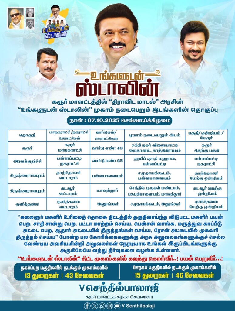 As directed by the Hon’ble Chief Minister of Tamil Nadu, Thalapathy M.K. Stalin, special camps under the #Ungaludan_Stalin initiative will be conducted across various locations in Karur District on 07.10.2025. I warmly invite all members of the public to actively participate in these camps and make full use of the government services being extended, reflecting our Hon’ble Chief Minister’s vision of taking welfare and governance directly to the people’s doorsteps.