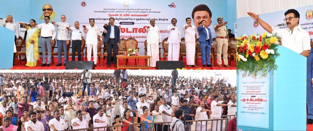 Under the leadership of the Hon’ble Chief Minister of Tamil Nadu, Thalapathy M.K. Stalin, who has saved lakhs of lives through the “Innu Uyir Kaappom – Protecting Lives 48” initiative, today at Coimbatore Government College of Arts, the “Coimbatore Road Safety Model City Project,” jointly organized by the Coimbatore District Administration, City Police, and Life Organization, witnessed participants taking the “I Am a Life Protector” pledge. I extend my heartfelt gratitude and respect to the Hon’ble Chief Minister on behalf of the people of Coimbatore District for his unwavering commitment to public welfare and safety.