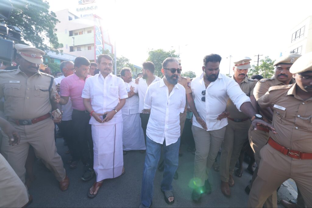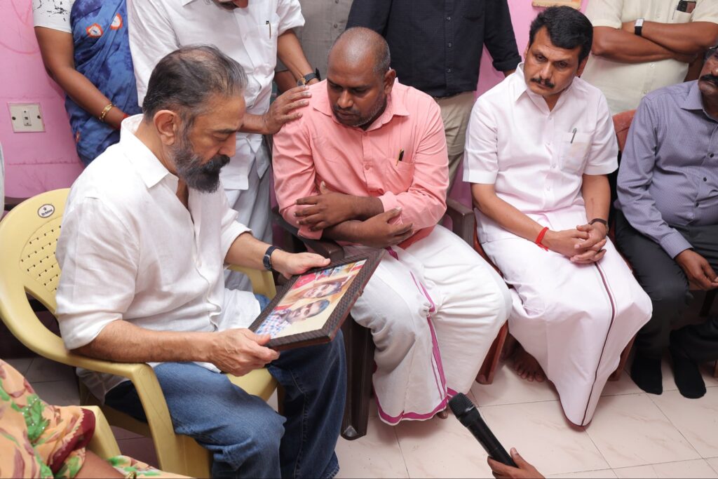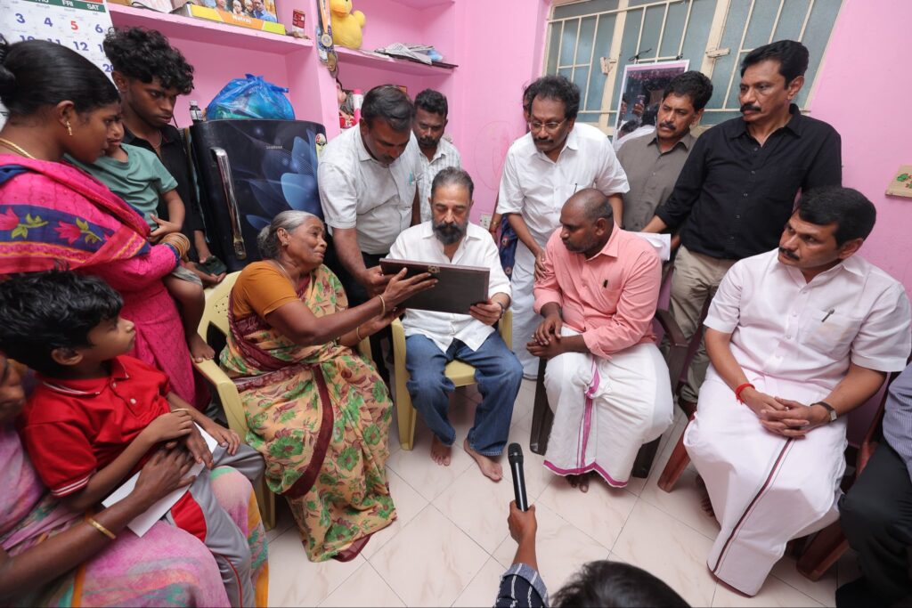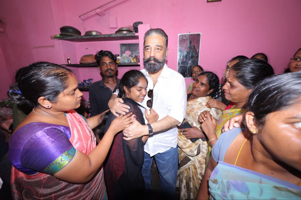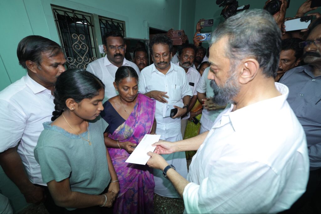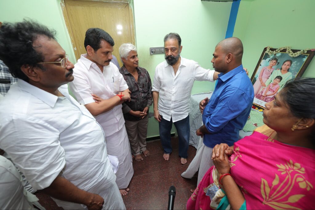 Under the guidance of the Hon’ble Chief Minister of Tamil Nadu, Thalapathy M.K. Stalin, Hon’ble MP and Makkal Needhi Maiam Party leader Mr. Kamal Haasan today met the families of those who tragically lost their lives in the unexpected crowd incident in Karur, offered condolences, provided relief assistance, and visited the incident site, accompanied by senior party leaders, demonstrating solidarity with the affected families.
