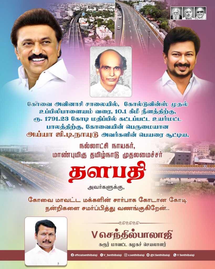 On behalf of the people of Coimbatore District, I extend my heartfelt gratitude and sincere respects to the Hon’ble Chief Minister of Tamil Nadu, Thalapathy M.K. Stalin, the visionary leader of good governance, for naming the newly constructed high-level bridge—spanning 10.1 km from Gold Twins to Uppilipalayam and built at a cost of ₹1,791.23 crore—after the esteemed Ayyar G.T. Naidu, celebrating both his legacy and the progressive development of Coimbatore.