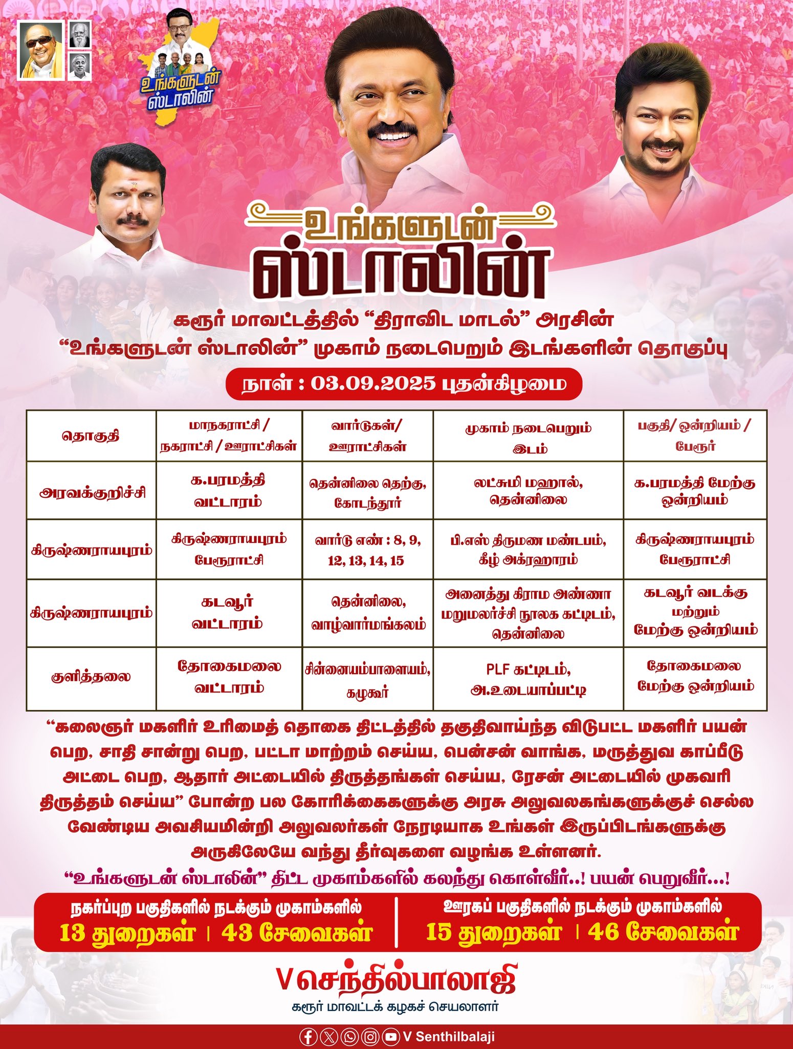 As per the directive of the Hon’ble Chief Minister of Tamil Nadu, Thalapathy M.K. Stalin, special camps under the Ungaludan Stalin scheme will be conducted across Karur District on 04/09/2025. I sincerely urge the public to make use of this opportunity and avail the benefits.